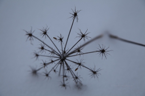 There is a deer feeder in the forest where I’ve been often lately and today I happened to see three deer running on a slope with snowy trees. It was such a delightful view. I hope to catch some photos of those three some time later. The forest is full of deer marks and it is so enjoyable to follow them. You can see how they’ve been running around enjoying the snow. The snow is about knee-deep at the moment, so with good gear walking in it is not a problem at all. I didn’t bring my snowshoes today but I still managed to walk in places where there weren’t any snowmobile tracks. It is a good work-out though, not to mention the snow-clearing job that was waiting for me in my home yard.