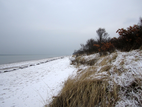 It was a spontaneous decision to head north from Berlin to the Baltic coast. We were aiming for the island of Poel, close to the town of Wismar and linked by causeway road to the mainland. It was the day of the first snows of the year, the wind threatening to freeze my nose off, but the beauty of seeing snow on the sands made it all worthwhile. I love Poel because of the landscape, its old brick church, the bird reserve and some wonderful beaches, the most hidden of which remain deserted even in summer when the rest of the Baltic coast is teeming with tourists. On a winter’s day, it felt like we had the whole island to ourselves: