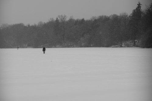 We took the tram from outside our building to the end of the line. There were only a handful of passengers when we got there, the tram stopping just before the point where the Seestraße becomes the autobahn and normal city life is handed over to the roar of car engines or, more likely, the traffic jams of rush hour. A disembodied voice told us in two languages to climb down from the tram and into the cold. Most turned left, into the enormous campus of the hospital. We crossed the street in the other direction, towards the frozen expanse of the Plötzensee.