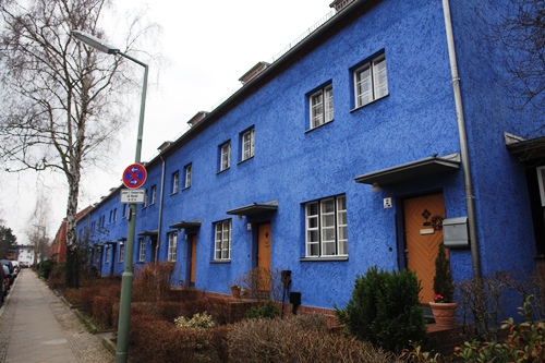 The Hufeisensiedlung in Berlin-Britz was one such project, designed by Bruno Taut and Martin Wagner. Over 1000 apartments make up the estate, divided between three-storey blocks of flats and single, terraced houses. As with much of the modernist architecture of the period, the design was functional and plain, with its use of colour being perhaps its most striking feature. What those first families most have thought when they came to their new homes, leaving behind their former cramped accommodations, is hard to imagine now. One thing is for sure – it retains its popularity. Over half of the inhabitants have lived on the estate for over twenty years, and that despite the fact that the average living space of the apartments is – by contemporary standards – relatively small.