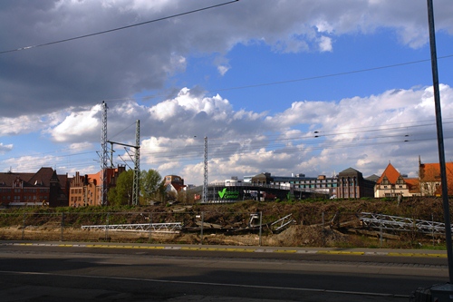 We climb down from the S-Bahn inside the new hall at Ostkreuz station, all shiny and bright before dropping down the staircase to street level and into edgeland. Somewhere beyond the junkyard is a football pitch. Abandoned buildings peel in the shadow of the new train station. A lonely pair of houses still show some sign of life, and the memory of when they must have been part of a much longer row before… what? Bombs? Socialist planning? A change of mind?