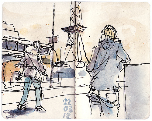 “Although it’s only quick sketching there’s always this feeling of “stepping outside of the moment”. You’re outside the movement and everybody else is in it. The drawing gives you a reason to stand and watch, a gesture that would not be always be accepted socially without a sketchbook in hand. In this state my relation to the environment changes, because I am not heading towards anything – I try to let the sketching just “happen”. I start to see things – and the relationship between things – that I would not have noticed before; if things go well, this might find its way into the sketch and be of some kind of common interest at the same time.”