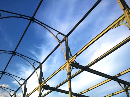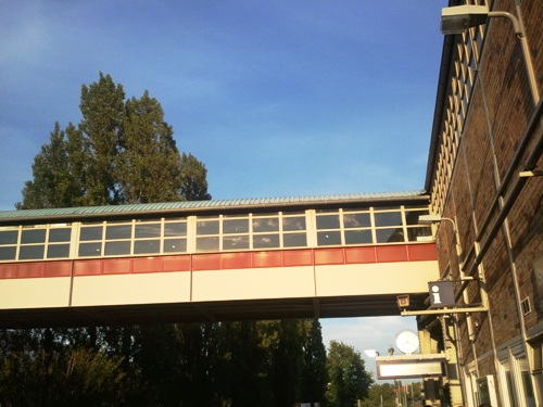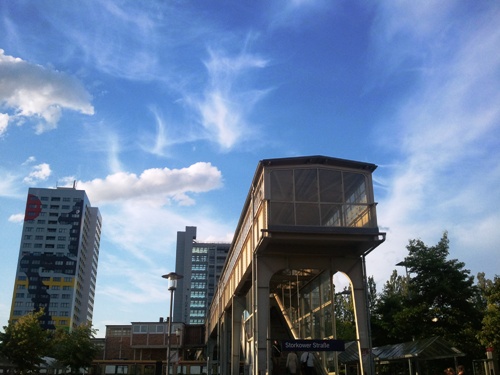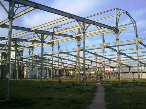 Walking to Sean’s new apartment on Friday we had to pass through the strange open spaces just south of the Storkower Straße S-Bahn station. This was once the central stockyard and slaughterhouse for Berlin although on even my old GDR maps this was referred to as its “former” function and until the 1990s it appears to have been little more than a wide open space. In the past decade or so the area immediately around the station has been filled with car parks for box-like shopping halls, some of the stores have built themselves into the old frameworks of the former buildings. Other metal frames have been left open and uncovered, standing in a patch of parkland, with grass growing beneath the iron skeleton, and locals drinking beer or grilling on those disposable barbecues as kids ride their bikes along ad hoc, dusty pathways.