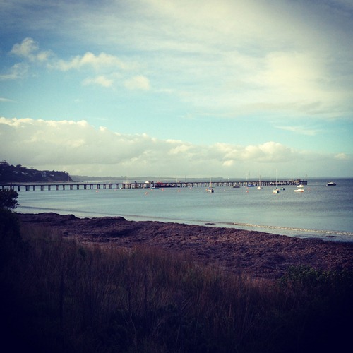 On this Sunday, a generation later, we make our way down late in the day, taking in the lush green farms, parklands, and dramatic coastal views. We stop at the safety beach to walk on the pier. The boys are hungry so we’ve brought hot chips to eat before we walk. We huddle on the beachside table. The air is rich with the scent of rotting kelp and fish but it is still so fresh and invigorating. After they eat the boys run ahead jumping across the mounds of seaweed and shouting to us and each other.