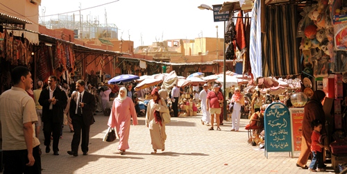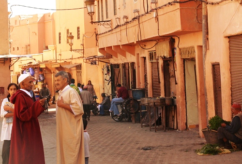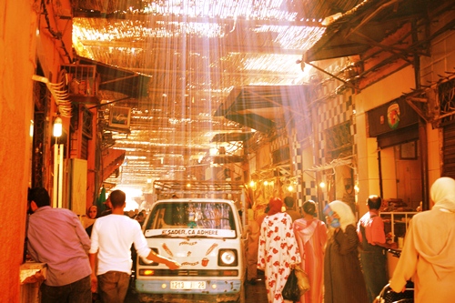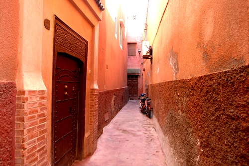 It is easy to get lost in the Marrakech Medina – a cliché, but it’s true, and also half of the fun. The buildings are squeezed together, to use all available space, and limit the penetration of the hot sun to the heads of those walking within. Through these narrow alleyways people throng day and night, between stalls that sell everything imaginable, dodging the vans, taxis, carts and bikes that compete for space with a sound of the horn and relentless momentum.