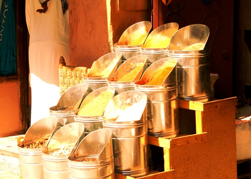 The business of the Medina is trade, transactions completed on the street or in wardrobe-sized shops piled high with products for sale. The cries follow you everywhere… “My friend…” the shopkeepers say, with a smile on their face. “Look in my shop…just a look…no need to buy…” And if you want to, it seems as if there is nothing you can’t take home with you. Carpets, scarves, pottery, leather, tables, door frames, candle-holders, all produced in backstreet workshops and sold on the main tourist routes. No money, no problem. A friend two shops down has a machine for AmEx, Visa or Mastercard.