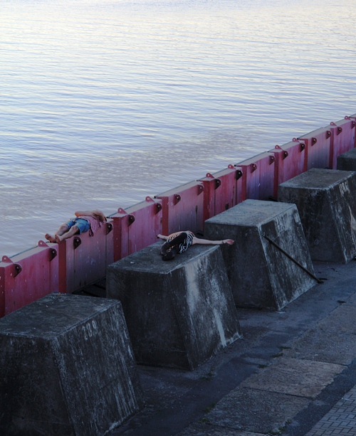At the ferry port the vehicles line up in rows beneath the enormous floodlights that will make the scene as bright as daytime as soon as darkness falls. Families pile out of overloaded cars – playing cards and pillows, crumbled magazines and half-eaten biscuits, fall onto the tarmac as doors open – whilst lorry drivers lean patiently against open windows or watch films on laptops balanced on the dashboard. A coach driver bows to pressure from the back rows and releases the smokers with a pneumatic hiss of the doors, and the foot passengers and bike riders sit on wooden picnic tables lined up by the raised footbridge, next to a row of brilliant blue portaloos.