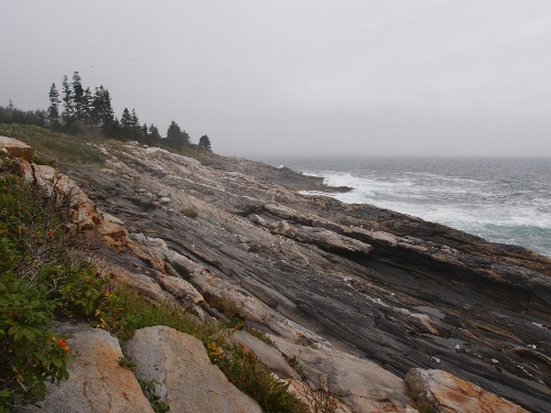 The rocks in question looked like pulled dough, long folds of near-black lava being bombarded by the sea, although this was peculiar to that location and they varied hugely as we travelled along the coast. Mount Cadillac was a mass of beautiful pink granite, covered with contrasting pale green and dark grey lichen, while at the bottom of that mountain in the town of Bar Harbor we found cubist rocks, cracked at 45 degree angles.