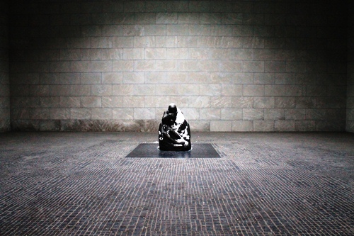 On Thursday Katrin’s walk took her from the Memorial to the Murdered Jews of Europe through the Tiergarten to the Soviet War Memorial, erected using the stone of Hitler’s Chancellery after the fall of the Nazi regime to the troops of the Red Army who flew the red flag complete with hammer and sickle from the ruined cupola of the Reichstag further along the street. And then through the Brandenburg Gate, itself commissioned in the late 18th Century to represent peace to the re-built Pariser Platz, that once stood in the no-man’s land of the Berlin Wall, and on to Unter den Linden, with its own collection of memorials including that to remember the Nazi burning of the books on Bebelplatz. At the Neue Wache a light dusting of snow had landed on the enlarged version of Käthe Kollwitz’s Pieta, created by the artist after her son died during World War I. During GDR times this building housed the “Memorial to the Victims of Fascism and Militarism” and was the location of a changing of the guard ceremony popular with the camera-wielding tourists that made it to capital of East Germany. In 1993 with the enlargement of Kollwitz’s statue in place, it was re-dedicated by Chancellor Kohl as the “Central Memorial to the Victims of War and Tyranny.”