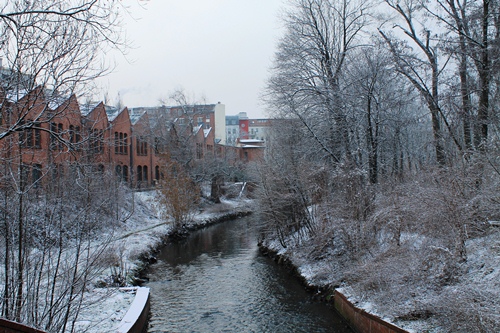 Our walk took us along the Panke River – which I have written about here and elsewhere before – past an old spa that became a theatre and is now a library, abandoned factories and a swimming pool-turned-cultural centre, modern pharmaceutical plants and modernist concrete car parks, lots of churches and graveyards, a brewery in the basement of a tower block and a couple of markets, railway lines and hidden courtyards, real Berlin corner pubs and Turkish private members clubs, and ended up with a stroll through the park and the views from the top of the old Flak Tower at Humboldthain. It snowed, and our neighbourhood has never looked more beautiful. The tour is going to be a lot of fun.