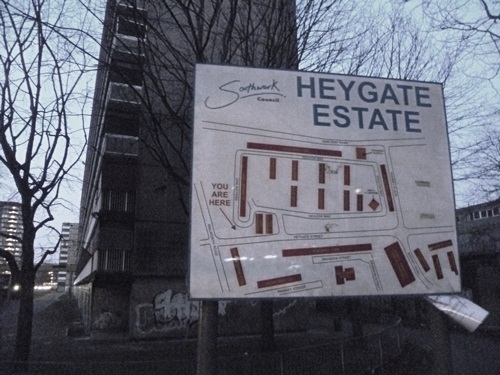 On the evening we stayed in Elephant & Castle we took a walk up to the Heygate, much of it locked away behind high green fences, although the odd light in the windows suggested there was some life still being lived in the otherwise abandoned estate. It was of course spooky in the dusk, and not a little scary, but reading the blogs and website and watching the documentary it was clear that the community had been trying to make something of their estate, even in its final months, from community gardens and open-air cinemas to go-kart races along the concrete walkways and flyovers and appeals to protect the urban forest in which those looming tower blocks stand and which is actually threatened by the development proposals.