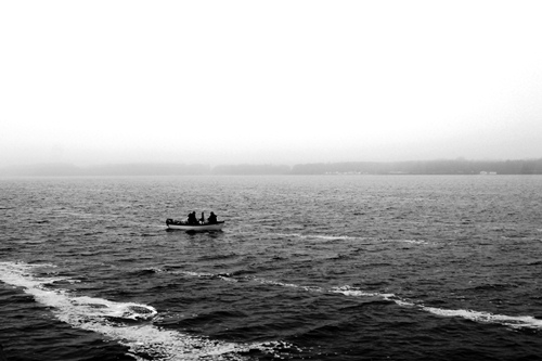 There only about eight of us hanging around on the jetty, hands stuffed in pockets against the cold. We nod, perhaps as much in order to get aboard and indoors. He sighs.