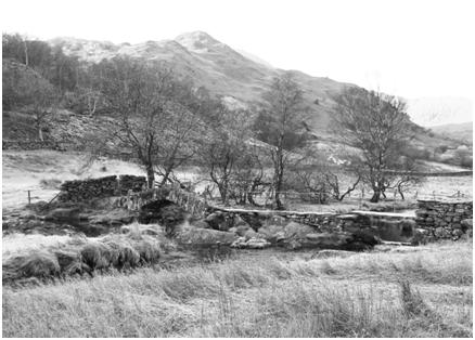 We walked back along the same track, back from the warmth and brightness into the cold and grey of the shadows and, as the daylight began to fade we passed the dark slate spoil heaps returning to the welcoming warmth of the hotel via the old ford on the Tilberthwaite track.