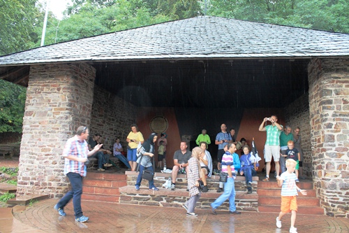 The mist retreats in stages, backwards and sideways, slowly but surely revealing the scene. The Saarschleife, that bend in the river, gradually comes into view. In the distance fork lighting strikes at irregular intervals. Rain falls on the river around one side of the bend. Sun shines down around the other. It is natural theatre at its best, and we know now why we walked through the rain and our companions know why they waited just that little bit longer. Last time the sun shone, but this time is better. Let the rain fall in Saarland. It makes what comes next all the more special.