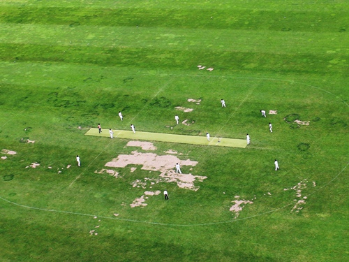 From the top of the tower we look down on the cricketers, white ants scurrying across the expanse of green. A wicket falls. A shout from below. The ants gather together, mingling in triumph. We look across the Olympic site, past the stadium itself, majestic at the core. A smaller arena is a hive of activity; a main stand full of souls, blue and white flags waving in the centre circle. Local heroes Hertha BSC are presenting their team for the season, the sound of the players surnames shouted by the fans drifting across to us on the wind.