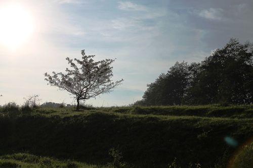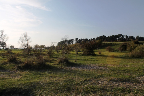 South of Lütow at the tip of the peninsula is a nature reserve, and we walked through a landscape of wetlands and grass fields, the water of the inland sea shimmering in the afternoon sunshine and the spires of the towns on the mainland blurry in the haze. We passed around the tip and then climbed a sandy hill held together with pine trees, and fine views north towards Wolgast where the shipyard cranes were visible in the distance. As we moved away from the water, inland and back towards the Lütow village, we stumbled across the campsite, walking through a well-organised if slightly run-down collection of camping places and static caravans. It was mostly empty, aside from a few caravan dwellers, but it was not hard to image the sound and the smells of the campsite in full summer swing, and the constant foot traffic back and forth through the trees from the tents to the beach.