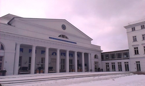 Which in some ways it still is. We arrived in the the white town and parked close to the station. The white buildings appeared as ghostly apparitions through the trees, made all the more unreal by the snow on the ground and the colour of the bleached sky. We wanted to get to promenade, to see the Baltic one more time, but there was no way through. At the gate to the Grand Hotel we were warned the premises were only for guests. There did not seem to be any guests around to be disturbed by our presence, so we made our way gingerly along the icy pathway through the garden. At the bottom, by the foundation stone for Heiligendamm that commemorates the fact that this is the oldest of Germany’s Baltic resorts (1793), only a guestcard for the hotel would get us through the gate. The sea was on the other side of the bushes, but there was no way through.