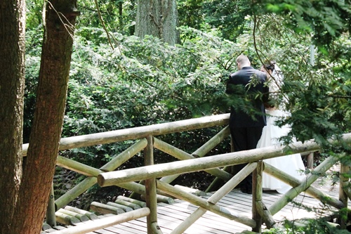 We walked in the opposite direction, soon passing the last remaining farm and country houses from when this was all a long way from the city boundaries. It was an interesting mix of 18th century Prussian architecture and those 1970s social housing blocks. In between the gaps were filled with garden colonies and allotments. We found our way to the Steinbergpark, on the edge of an open expanse of protected wetland. Until Lotte found it on the map, I had never heard of this place, but it was lovely, a small but hilly landscape of trees and footpaths, a stream with a man-made waterfall stumbling down to a lake at the bottom. A bride and groom posed for pictures whilst the maid of honour did her best to stop the bride’s dress muddying on the footpath. The price of romance.