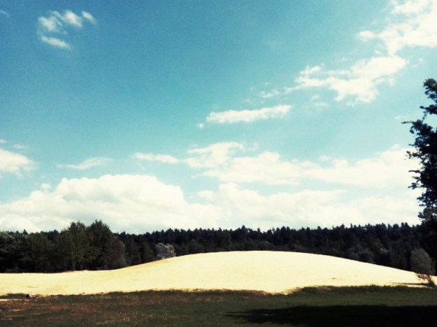 The stroll to Grunewald station takes us past the huge sand dunes that are the legacy of the 17th century, when some 3.5 million cubic metres of sand was removed for construction purposes. Now it is a nature reserve. At the top of the hill the Kindergarten teacher releases her charges and they fly down the hill, shrieking and laughing, tumbling in the sand. In the shade the forest is a haven for mosquitoes, worse this summer than in recent memory, and the smell that lingers as we walk on towards the station is that of lake water, sweat and insect repellent. The smell of summer. Not far from the station someone has built a shelter out of logs and sticks. A trolls den or a hiding place from the Blair Witch? A summer camp project left behind to allow the forest wanderers’ imaginations to run riot.